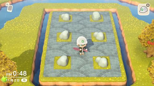 島作りの第1歩として採掘場を作りました こういう岩6個を1ヶ所に固めて日々の採取を効率的にしたものです 作り方は色々なサイトや動画に載ってますが、今回はこちらの記事を参考にしました zukkazu.com 簡単に言うと「島の地面全部をマイデザで埋める→岩を湧…
